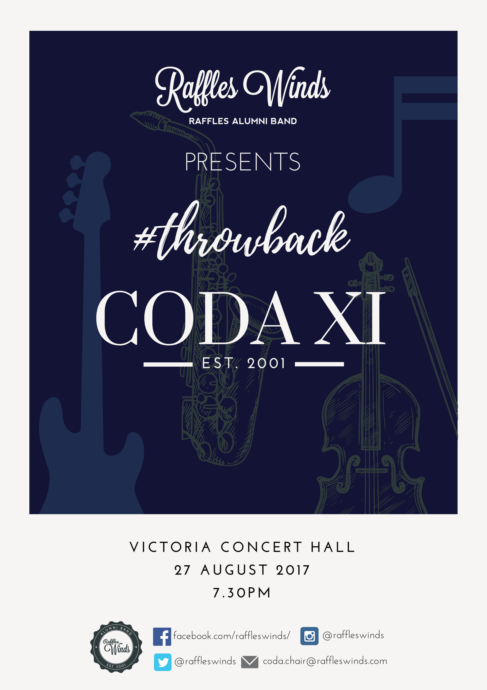 Coda, a musical term used to describe a concluding passage in a composition, parallels our final experience as band alumni. In 2006, Raffles Winds held its first Coda concert in the Victoria Concert Hall. This year, Raffles Winds will be holding its 11th edition of this concert series back at the newly refurbished Victoria Concert Hall; and you can expect more boogey and goodey lined up!